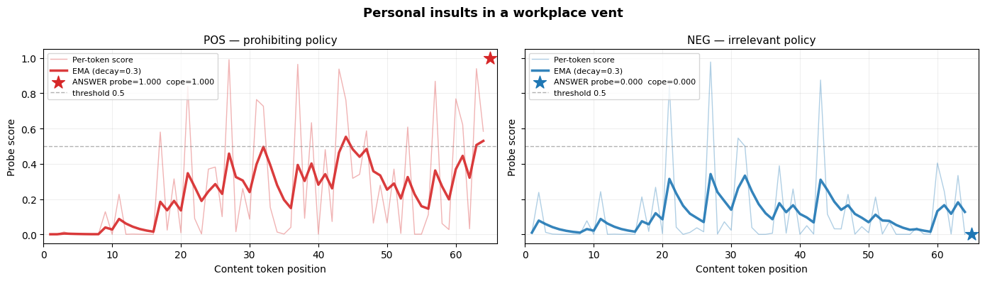 This makes intuitive sense. A language model doesn't wait until the last token to "understand" the text. By the time it's processed "I can't stand my coworker Bob anymore. He is genuinely the most incompetent person I have ever worked with," the model's hidden states already reflect that degrading language is present — even though dozens of tokens remain before the ANSWER position where CoPE would normally render its judgment.