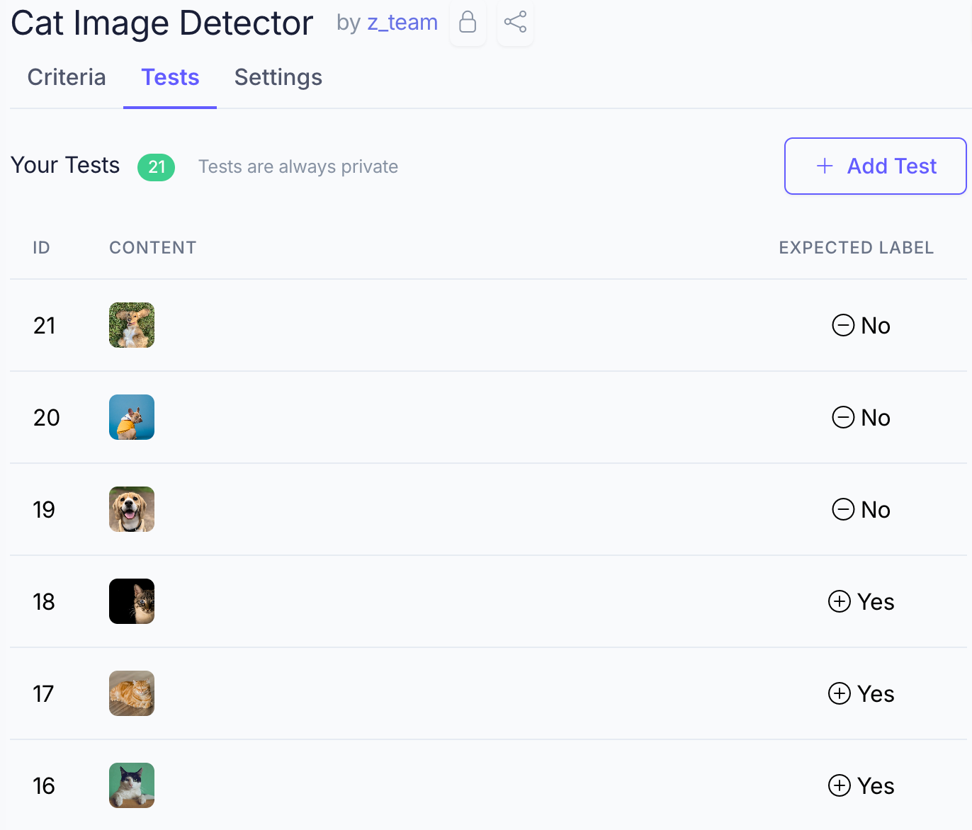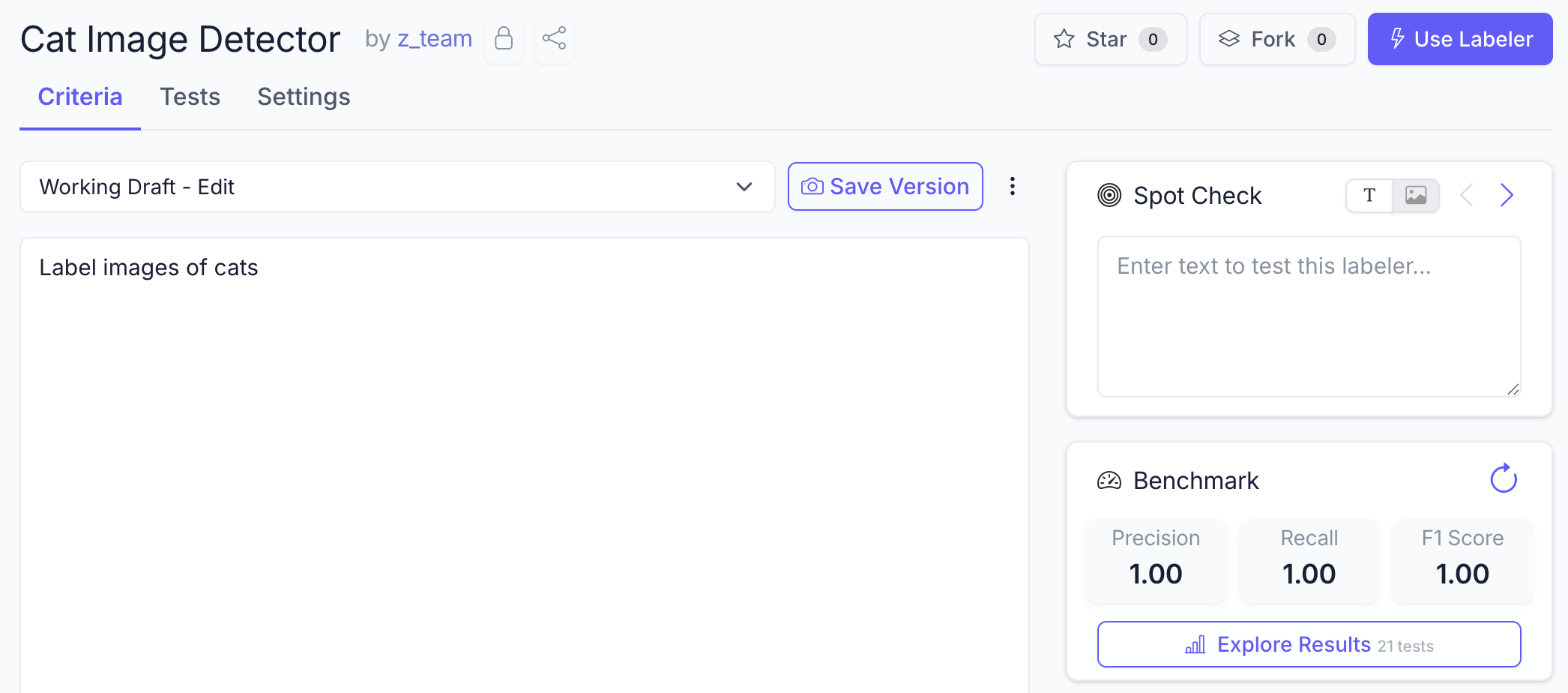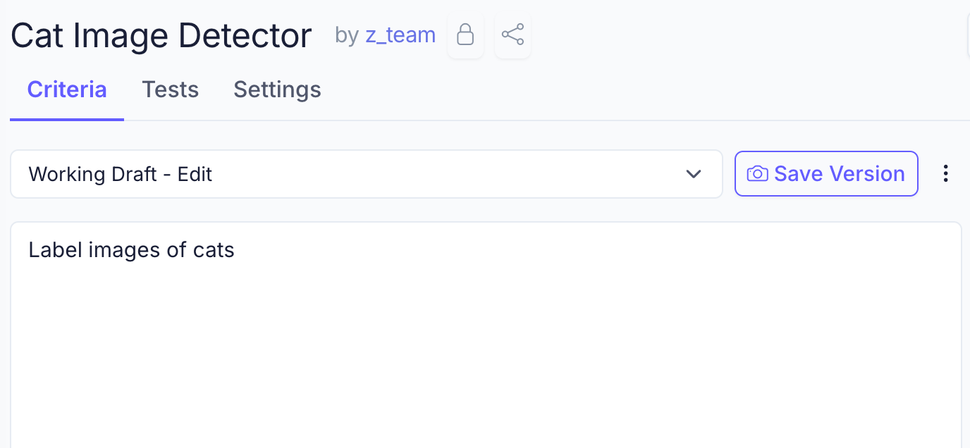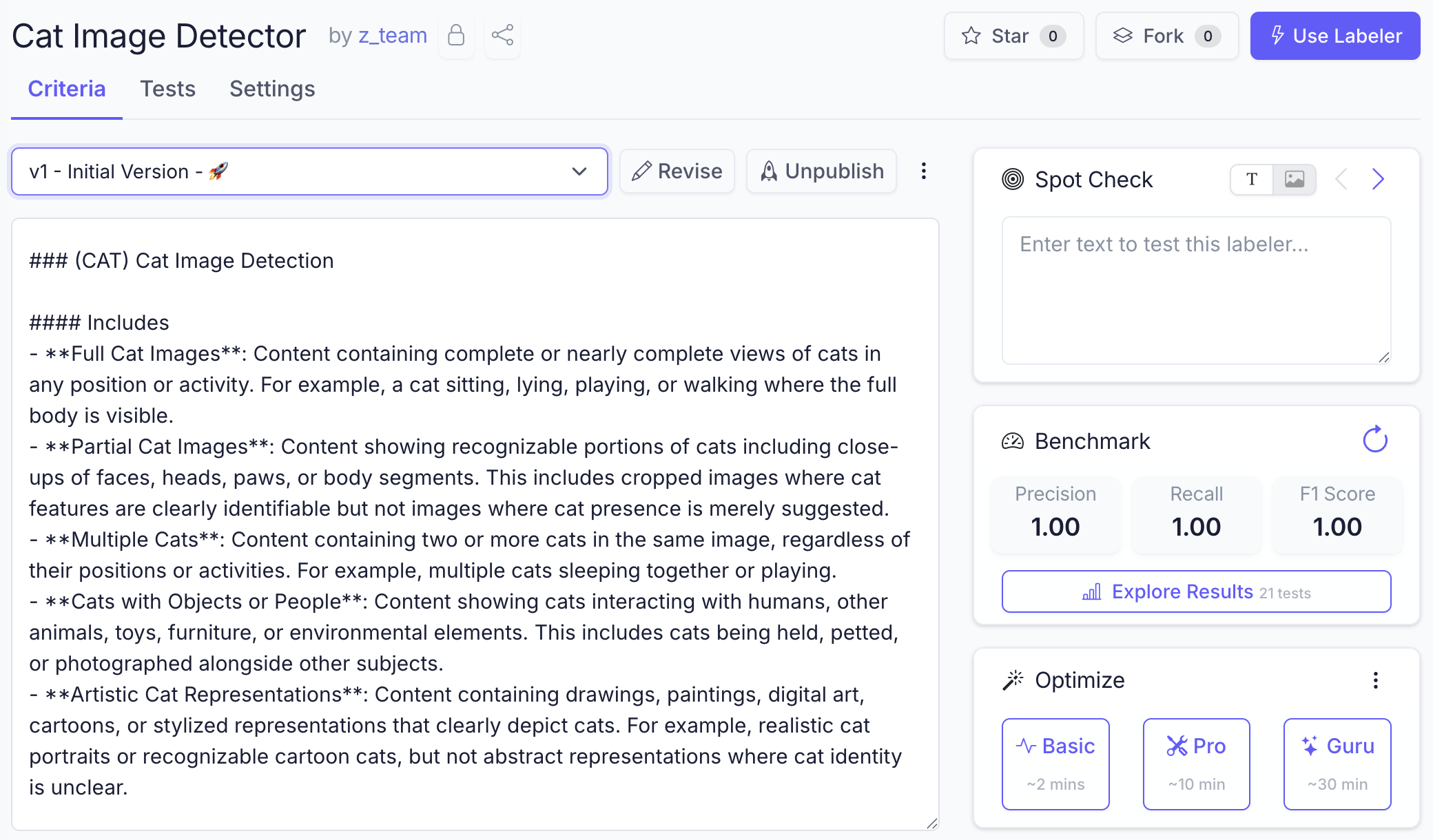 As an example, here is how easily we created a labeler for cat images. First, we started with a very basic criteria definition.